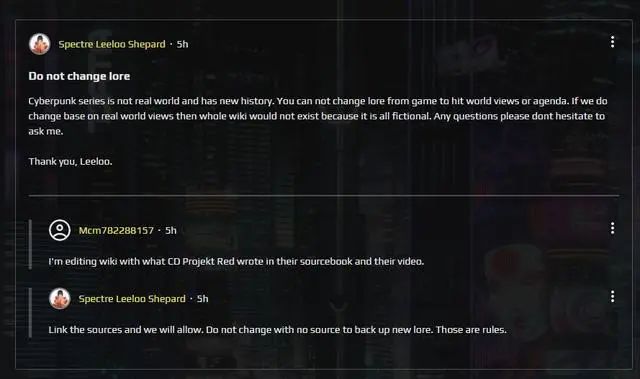 「不要改變內容,賽博朋克系列並不是真實的世界,它有著新的歷史,不能用現實世界的內容來篡改遊戲,如果完全基於現實世界,那麼整個wiki都將不復存在,因為它就是虛構的。」