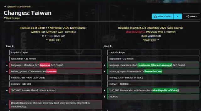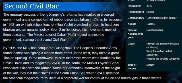 而辱華的依據,則是來自國外Fandom上關於賽博朋克2020桌游的設定介紹,在故事背景設定中,存在大量不符合社會主義核心價值觀的內容,比如zf威權論,多次爆發的內部戰爭,以及tw由於親日而得到遠高於大陸的發展水平等等。