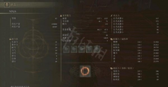 主要偏向血量與感應屬性,圖為最終通關屬性(帶大盧恩)。