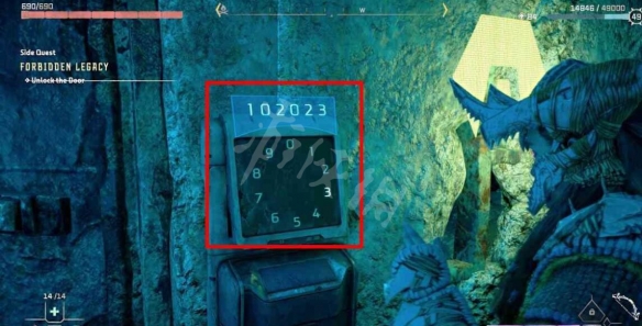 第一道門的密碼為102023。位置在跳到塔上之後。