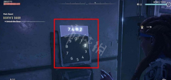 如果在門口的密碼面板等了好久但沒有進行操作或多次輸入錯誤密碼的話,埃洛伊會說類似“也許應該檢查一下數據點,在特拉維斯·塔特處找到的日誌里有個數字,它可能會起作用…是什麼來著?”這樣的話。