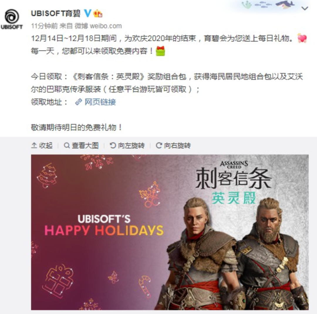育碧官方微博今天發布公告,宣布將於12月14日至18日期間,每天都為玩家們送上禮物。今天玩家們就可以領取《刺客信條:英靈殿》獎勵包。一起來了解一下。