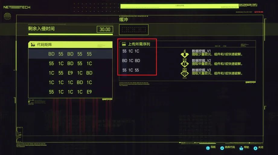 左側為5X5的密碼字元區,右側紅框處為破解密碼要求輸入的字元串,字元串後為對應的獎勵,選擇第一個字元串後將開始倒計時,玩家需要在限定的時間(剩餘入侵時間)內輸入指定字元串中的一個來完成破解。