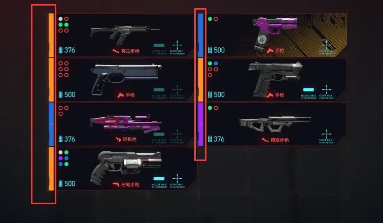 採用了在圖標左側色條作為標識,依次用橙色、紫色、藍色、綠色、白色來表示物品的稀有度。