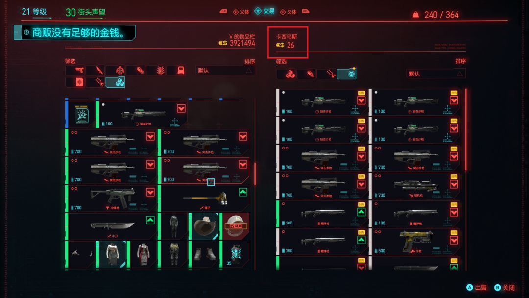 另外一個小販或自動售賣機手裡的錢有限,如果一次囤太多,可能要多跑幾家才能全部賣掉,下圖紅框處就是商人手中的金錢數額,商人手中金錢不足時會有提示。