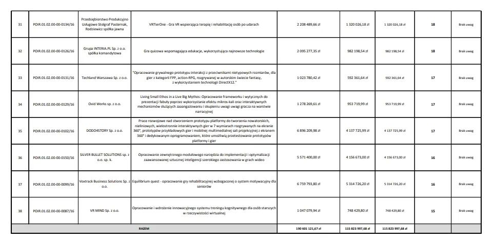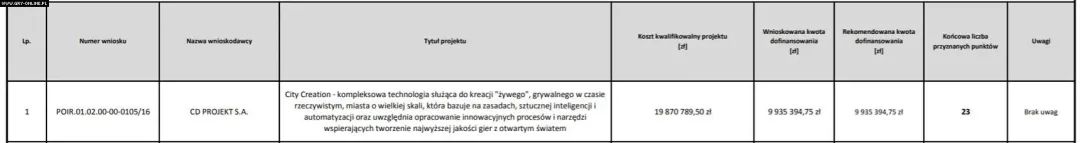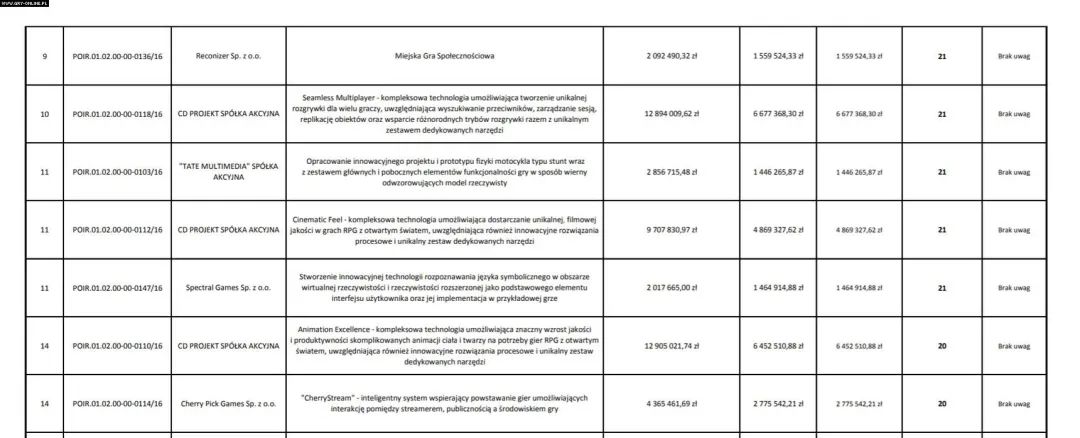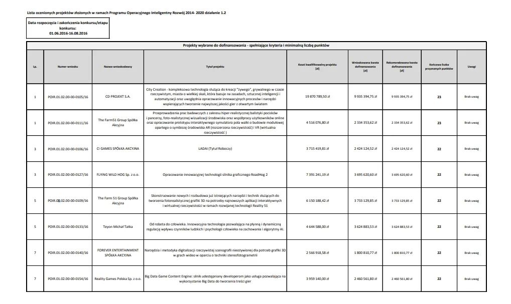 2016年,作為上述項目的一部分,波蘭國家研究與發展中心資助了波蘭遊戲開發者38個項目,撥款共計1.16億茲羅提(約合人民幣2.08億)。CDPR分走了「蛋糕」中最大一塊,幾乎佔到90%,並藉此實施了4個項目。