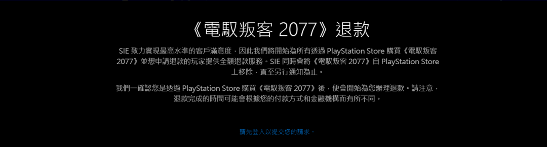 「CD PROJEKT 華沙辦事處管理委員會在此公開索尼互動娛樂(SIE)將《賽博朋克2077》從 PlayStation 商城下架直至另行通知的決定。這是我們與 SIE 就所有通過 PlayStation 商城購買《賽博朋克2077》,並希望在此時退款的玩家進行討論後做出的決定。所有之前在 PlayStations商城上購買的數字版遊戲,仍然可以供各自買家遊玩,玩家仍可以在零售商處購買遊戲的實體版本。所有的遊戲拷貝,無論是數字版的還是實體版,都將繼續得到公司的支持和更新。
