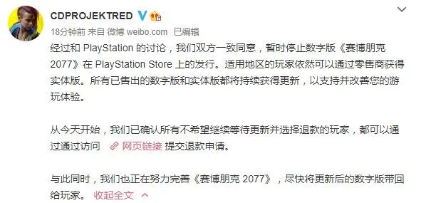 CDPR官方推特(微博)也發布了類似內容的公告,同時向玩家承諾:「我們也正在努力完善《賽博朋克 2077》,盡快將更新後的數字版帶回給玩家。」