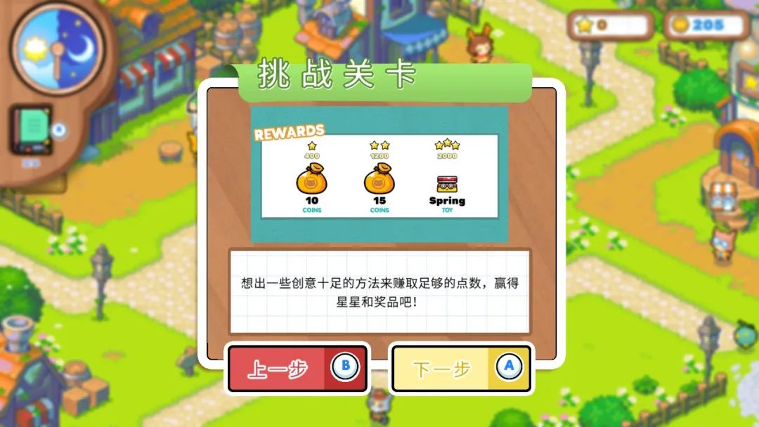一部分可供擺放的新機關會藏在地圖里,獲得後才能在關卡中解鎖使用;而流程中一些NPC也會給你支線任務,完成後可以獲得星星(用以承接部分主線關卡)和額外的機關以及貼紙。這些收集要素固然也是遊戲樂趣的一部分,但形式內容過於重復的關卡和枯燥的收集過程,可能會很快地消磨玩家的新鮮感,讓遊戲性大打折扣。