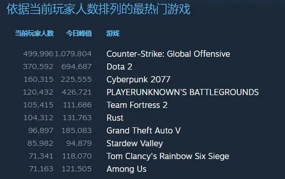 可以看到,長青的《反恐精英:全球攻勢》《DOTA2》和《絕地求生》仍是峰值的前三名。其中《反恐精英:全球攻勢》以 107 萬的數據穩居第一。而《賽博朋克2077》以 22 萬的峰值在線成為純單機內容的遊戲類別的第一。雖和首日當日峰值有落差,但仍足見其影響力。