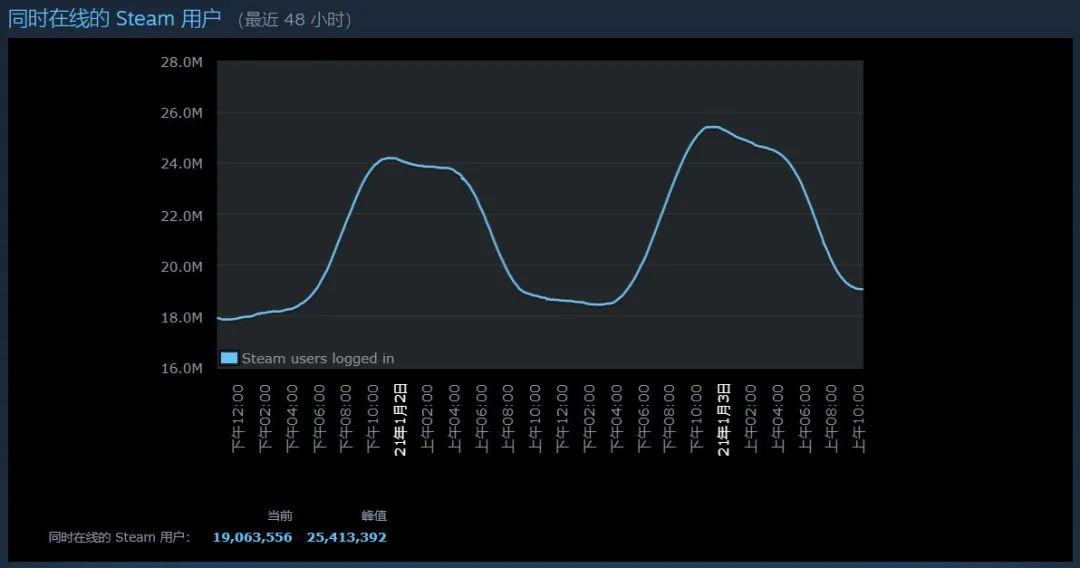 根據 Steam 的官方統計,Steam 同時在線用戶數於 1 月 2 日 22 時 11 分突破 2500 萬,隨後於大約 23 時 23 分達到了新的峰值 2541 萬 3392 人。