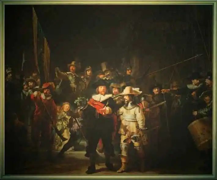 11、倫勃朗《夜巡》 | 真:中間的人物戴黑帽子 | 假:中間的人物不戴帽子