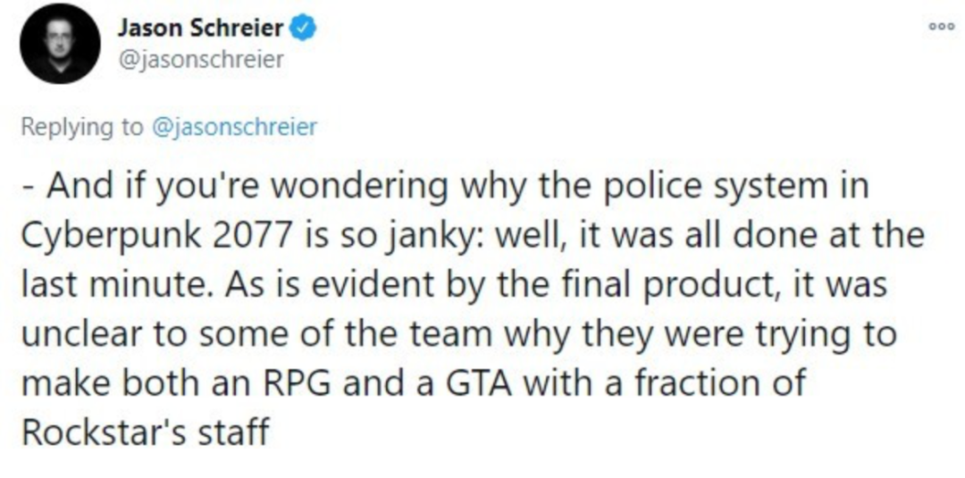 除此之外,Schreier還表示如果你在想為什麼《2077》的警察系統會如此糟糕的話,那麼原因就在於該系統是在最後關頭完成的……