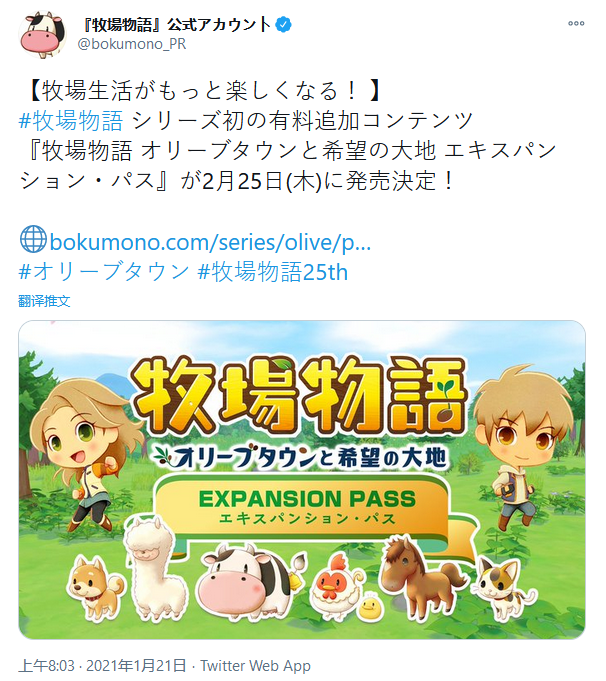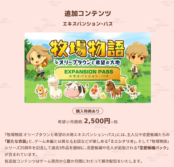 《牧場物語》官推公開了最新作《牧場物語:橄欖鎮與希望的大地》將推出季票的消息。該季票會陸續更新主人公和戀愛候補的大量新服飾、各種新支線任務和增添前作中可攻略對象,售價為2,500日元+稅。本作將於2月25日登陸Switch,支持中文。