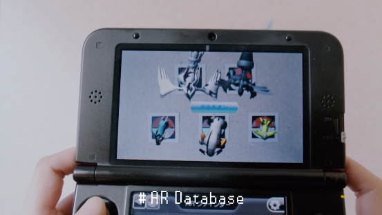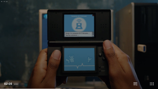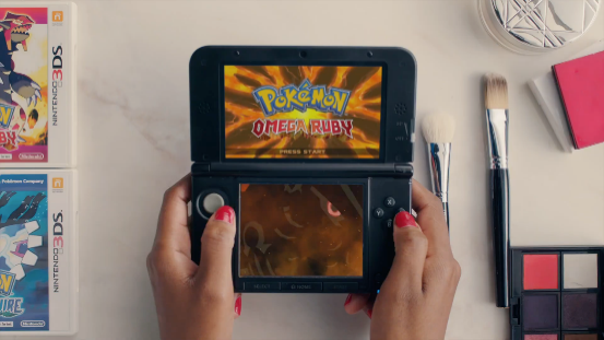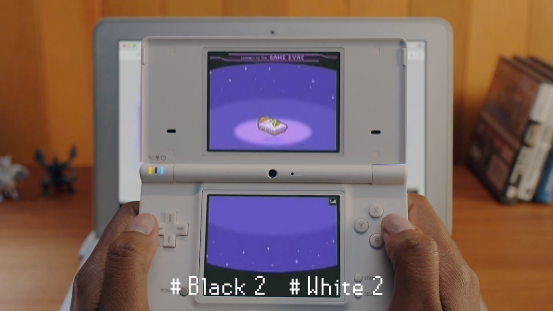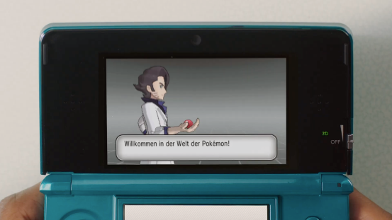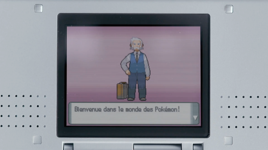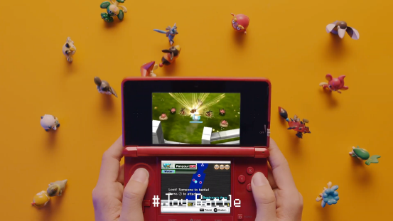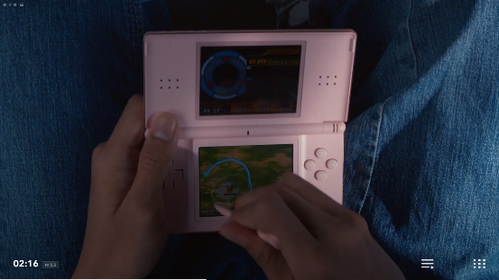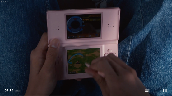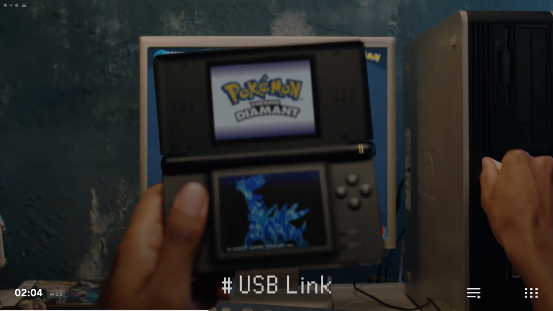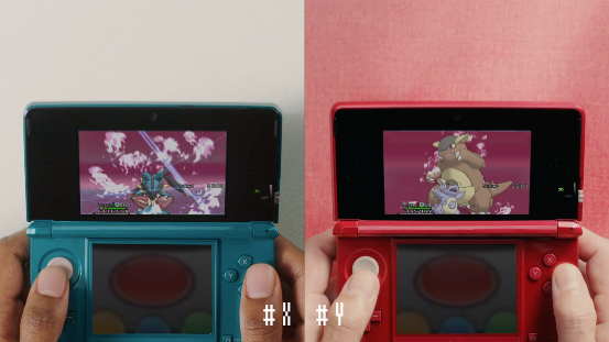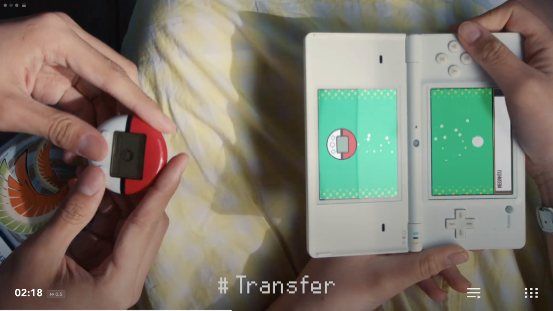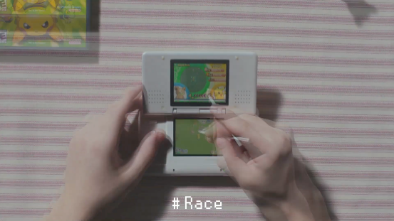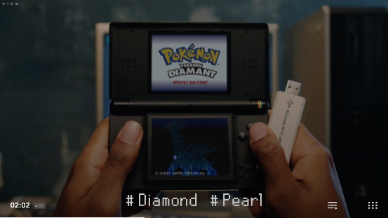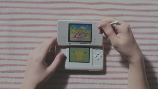 畫面隨著NDS的翻蓋一起翻轉,我們看到的是NDS上的首款寶可夢遊戲《寶可夢 沖刺》。本作當年還被用作NDS的3D機能演示,只可惜遊戲實際的品質並不理想,一點也不好玩。