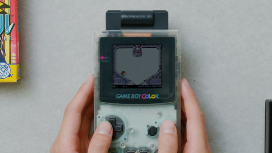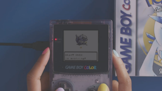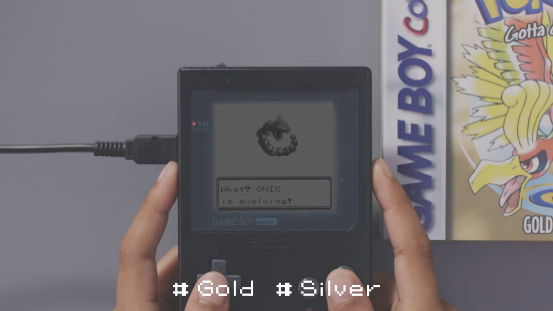 《寶可夢 金/銀》除了兼容黑白的GB外,還對應了GBC的全彩顯示,畫面得到了飛躍式的進步。視頻中大岩蛇在進化到大鋼蛇的同時,GBP也進化到了GBC,甚至玩家的手指甲也變成了全彩~