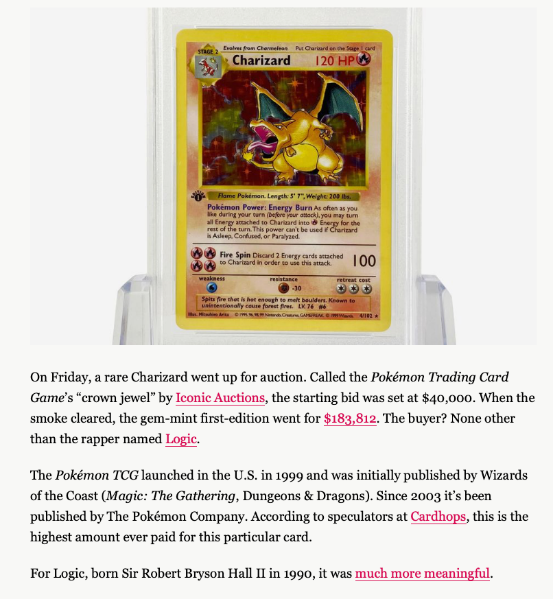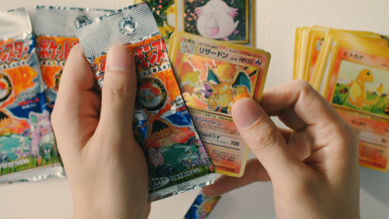隨著遊戲的熱賣,緊接著各種其他內容也跟上了腳步,卡牌便是其中之一。視頻中這包,應該是XY那會兒的重製版,而當年的初版如今價值不菲。這裡開出的這張噴火龍的美版,在去年甚至拍除了18.3萬美元的高價!