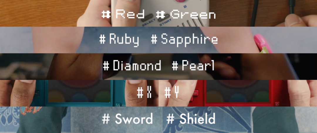視頻開場,從劍盾開始倒推,展示每一代的正統作品。而每一代顯示的語言也都不一樣,確實給人一種「全球不同語言玩家相連」的感動。