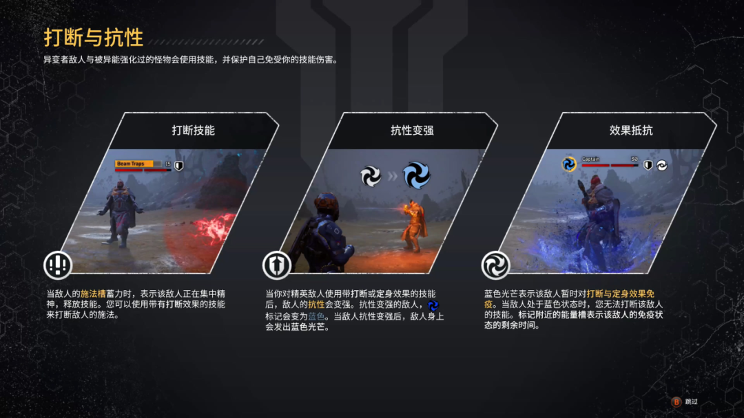 而在戰鬥中普通的雜兵會被我們的異能攻擊或槍械攻擊打出硬直,但對於精英類敵人有時是無法使用通常手段來打斷它們的行動的,只有具有打斷效果的異能才能打破它們的蓄力狀態。部分敵人也會進入打斷無效的特殊狀態,此時要專注迴避,在敵人霸體效果結束後再伺機攻擊。