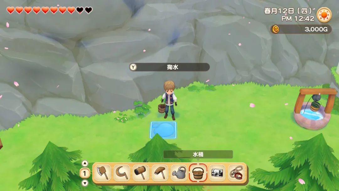 中野: 在《橄欖鎮與希望的大地》里,下雨過後森林裡會累積水窪或水池。對於身為開拓者的玩家來說,水窪或水池是個很礙事的存在。小水窪可以利用鎚子或鋤頭來整地,但水池就沒辦法了。這時就必須透過人力來「清理淤泥」了。