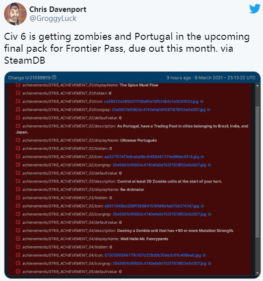 《文明6》新紀元季票的大部分內容已推出,目前還剩一個DLC未公布。近日據外媒Gamerant報道,這款將於3月發布的DLC將追加殭屍模式,以及新文明葡萄牙。該信息來自SteamDB,有玩家在SteamDB上發現Firaxis在游戲中置入了新成就。