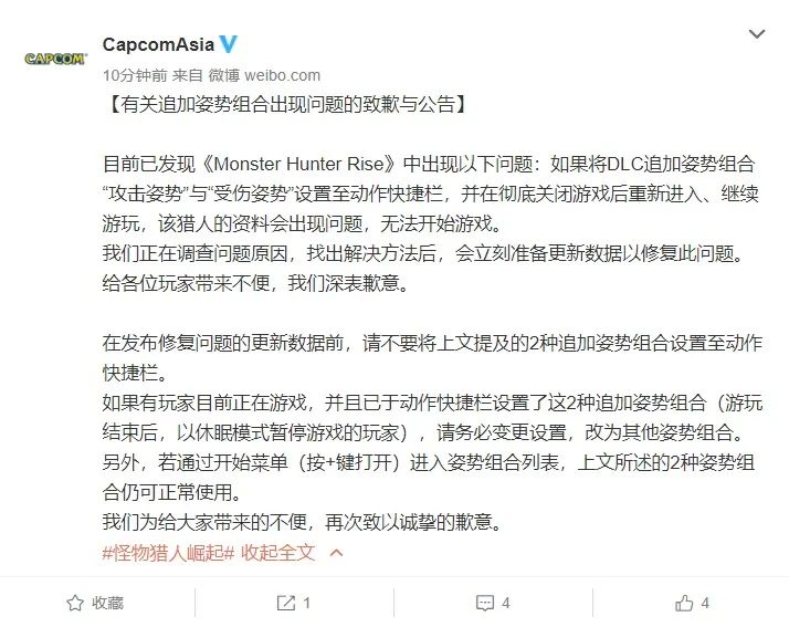 卡普空表示,目前已發現《Monster Hunter Rise》中出現以下問題:如果將 DLC 追加姿勢組合 「攻擊姿勢」與 「受傷姿勢」設置至動作快捷欄,並在徹底關閉遊戲後重新進入、繼續遊玩,該獵人的資料會出現問題,無法開始遊戲。我們正在調查問題原因,找出解決方法後,會立刻准備更新數據以修復此問題。給各位玩家帶來不便,我們深表歉意。在發布修復問題的更新數據前,請不要將上文提及的 2 種追加姿勢組合設置至動作快捷欄。如果有玩家目前正在遊戲,並且已於動作快捷欄設置了這 2 種追加姿勢組合(遊玩結束後,以休眠模式暫停遊戲的玩家),請務必變更設置,改為其他姿勢組合。另外,若通過開始菜單(按 + 鍵打開)進入姿勢組合列表,上文所述的 2 種姿勢組合仍可正常使用。我們為給大家帶來的不便,再次致以誠摯的歉意。