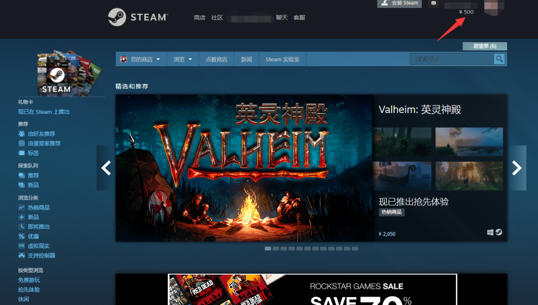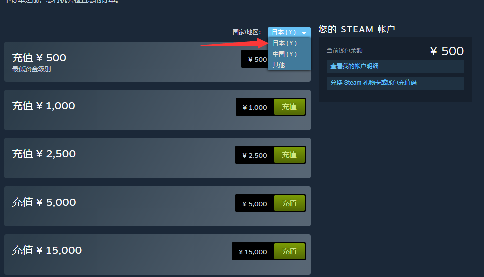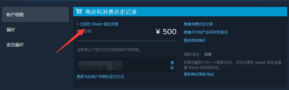 這時,最重要的一步,點擊下圖箭頭處的為steam錢包充值。
