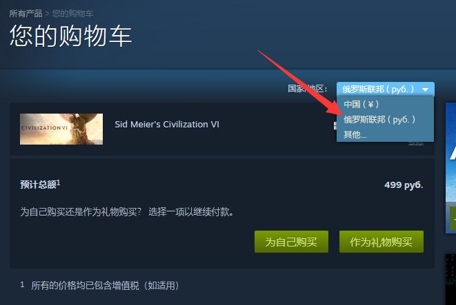 3.在購買時點擊右上角選擇俄羅斯聯邦。