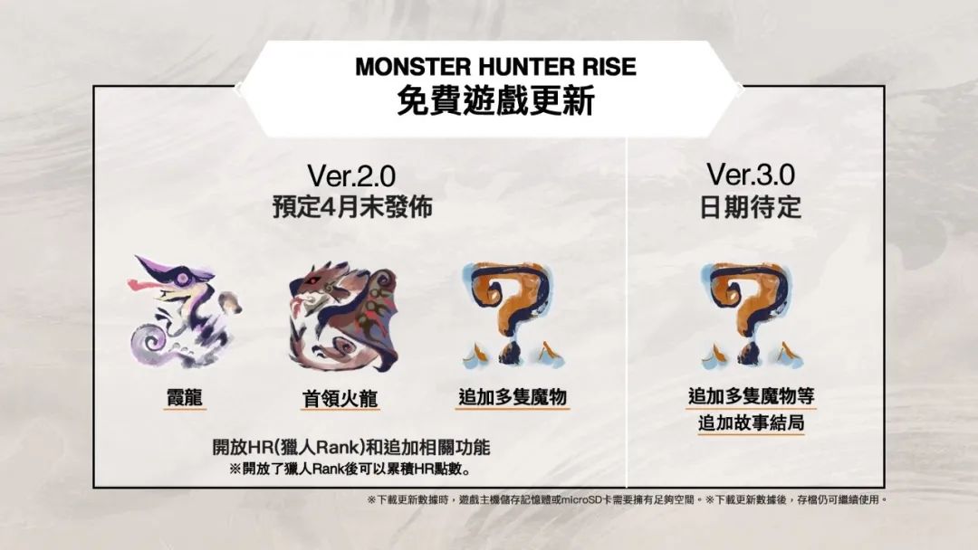 在預定於 2021 年 4 月底發布的第一次更新中,「獵人 RANK(HR)」會在完成特定任務後開放,完成村莊任務和集會所任務可以累積獵人 RANK 點數,進而提升獵人 RANK,挑戰新追加怪物的任務。另外,也預定會追加怪物「霞龍」和「首領火龍」等多隻怪物以及故事結局。