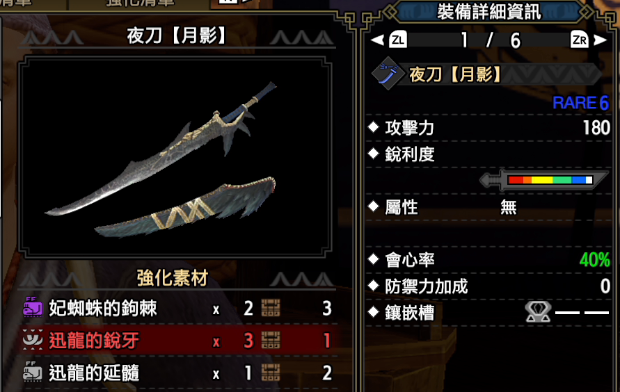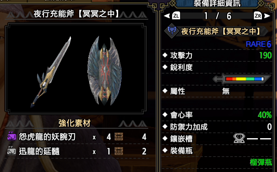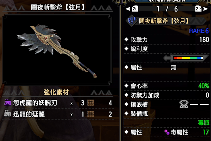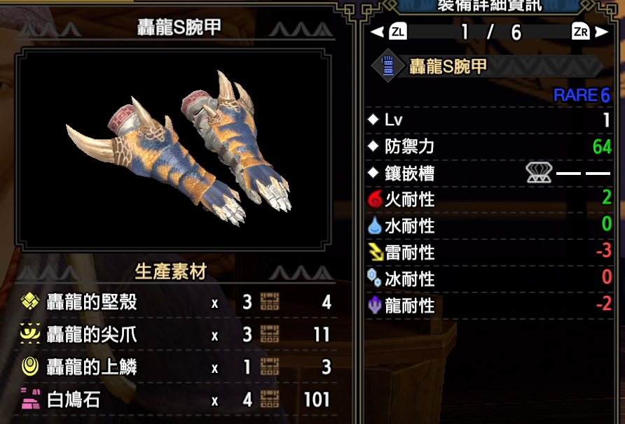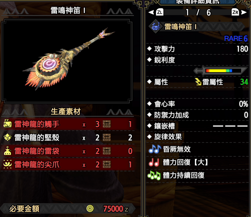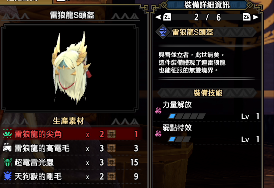 雷狼龍頭:力量解放1,弱點特效1,1級孔一個