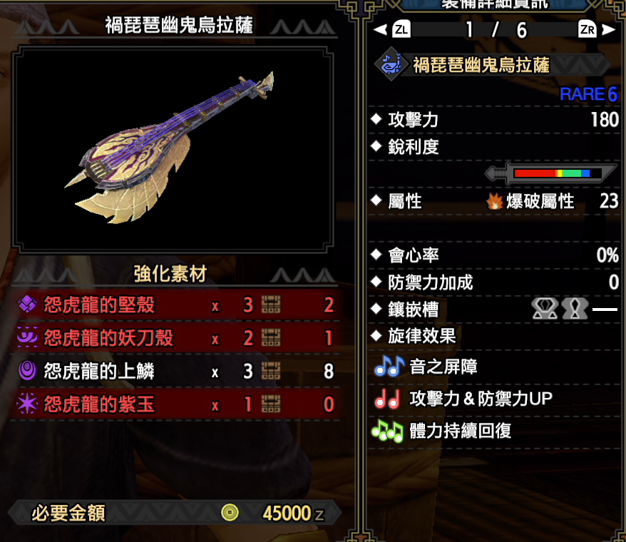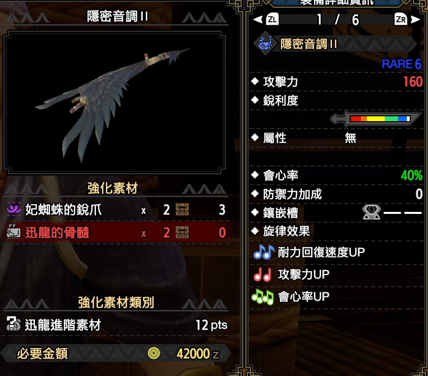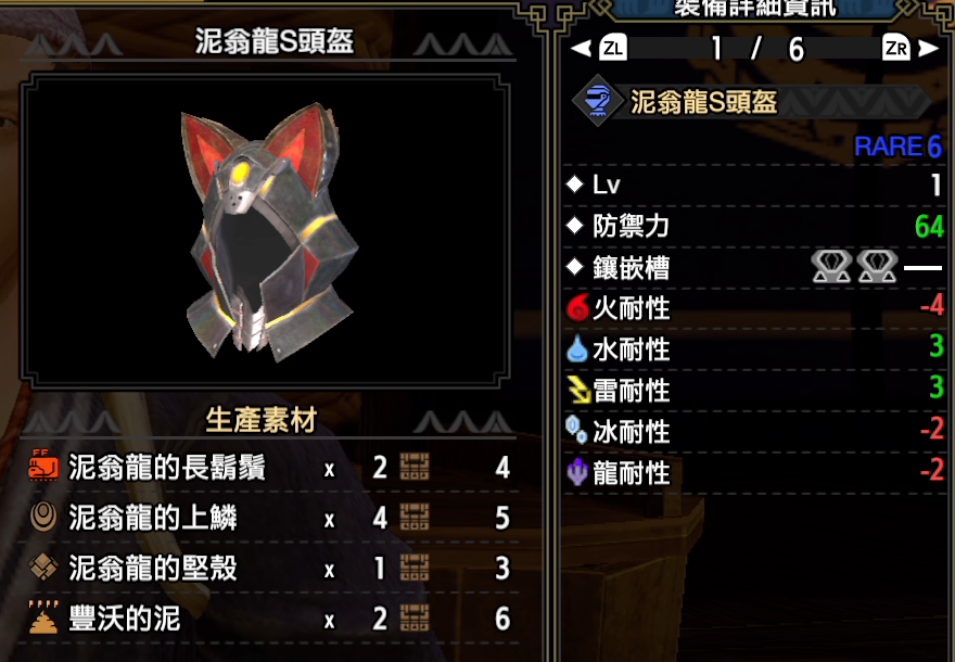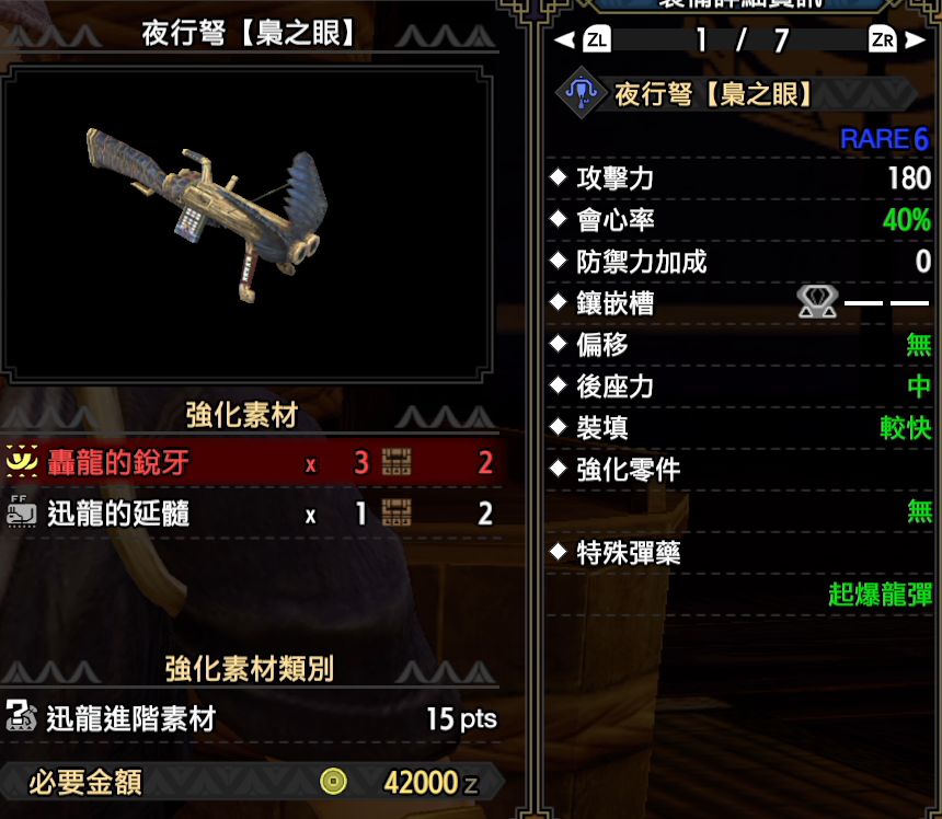 硬甲龍頭(繁體原角龍):貫通彈•貫通箭強化2,昏厥耐性1,一級孔一個