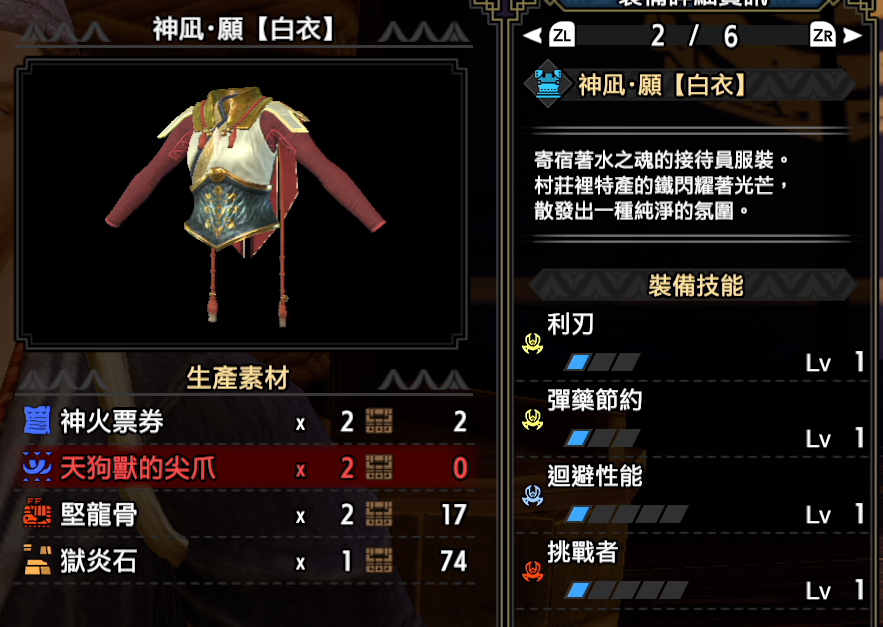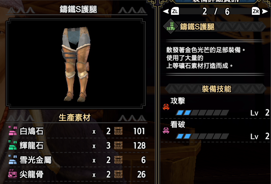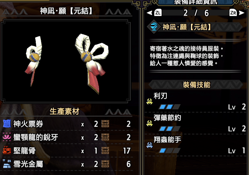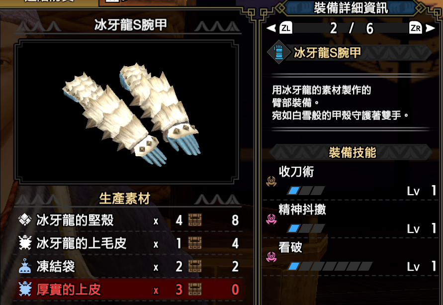 裝備總計利刃3,彈丸節約3,減輕後坐力3,裝填速度3,超會心2,弱點特效2,看破2,翔蟲能手1,迴避性能1,挑戰者1,冰屬性強化1,力量解放1。