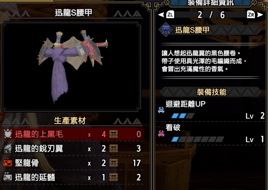迅龍腰:迴避距離UP2,看破1,二級孔一個
