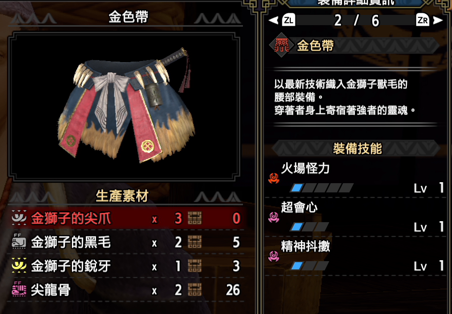 金獅子腰:火場怪力1,超會心1,精神抖擻1,1級孔一個
