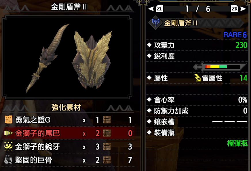 由於本作中盾斧的各種珠子簡直是吃孔機器所以就別想著防強防性增彈拉滿了,不存在的。盾斧目前思路分為兩種,一種為金獅子盾斧配合鈍器打空解,另一種為迅龍盾斧配合超心弱特打電鋸,下面兩種各放一套以供參考。
