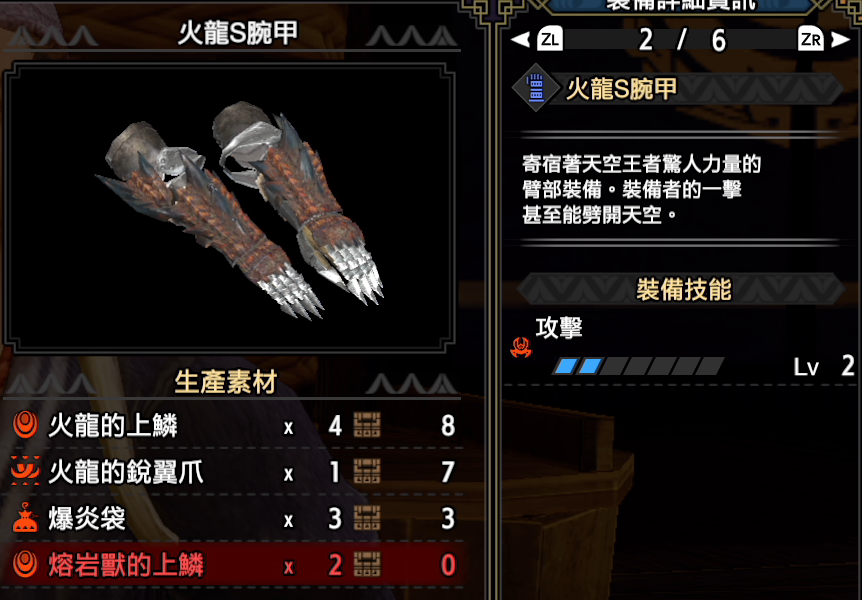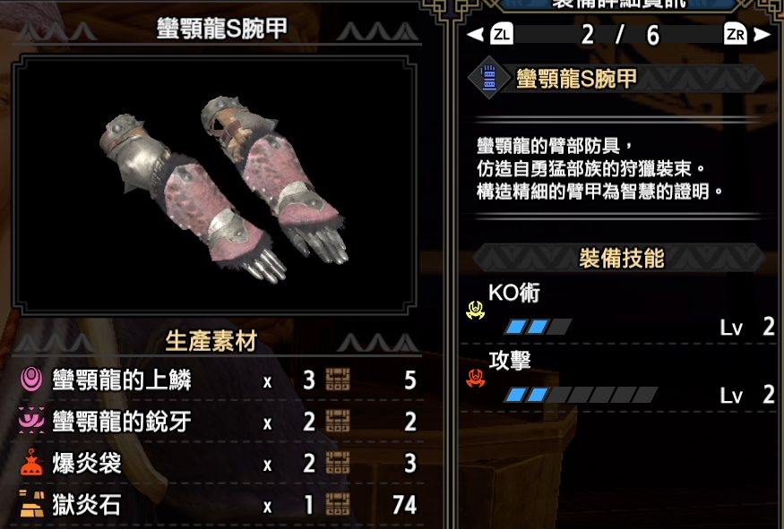 蠻顎龍手:KO術2,攻擊2,一級孔一個(火龍手備選,攻擊2,二級孔一個)