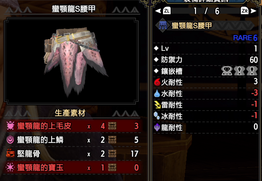 蠻顎龍腰:攻擊2,二級孔一個,一級孔兩個(本部位可替換度較高)