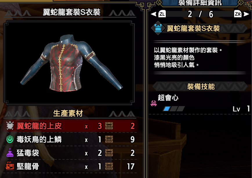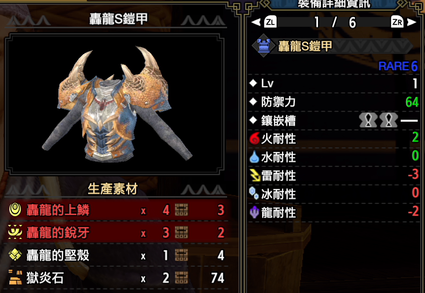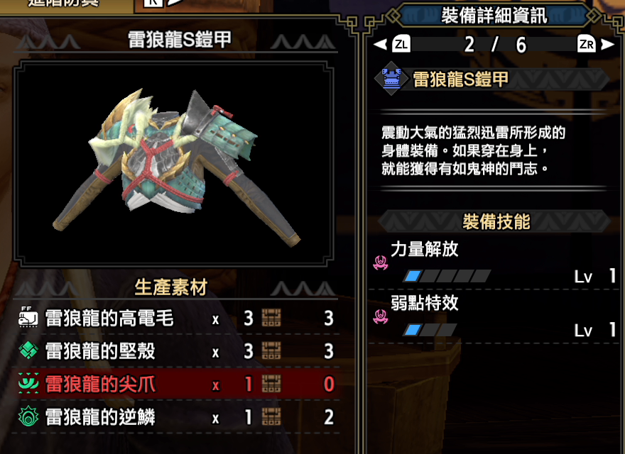 雷狼龍胸:力量解放1,弱點特效1,1級孔一個