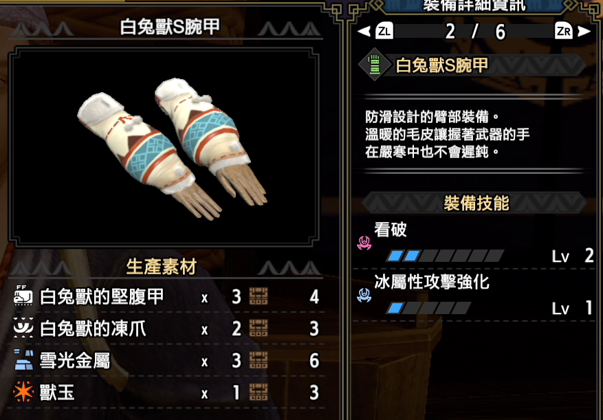 白兔獸手:看破2,冰屬性強化1,二級孔一個,一級孔一個
