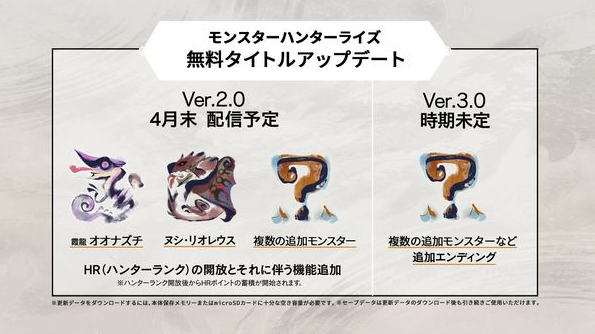 該更新預計於4月底正式推出,將解鎖獵人們的HR等級上限,同時增加更多的新怪物。