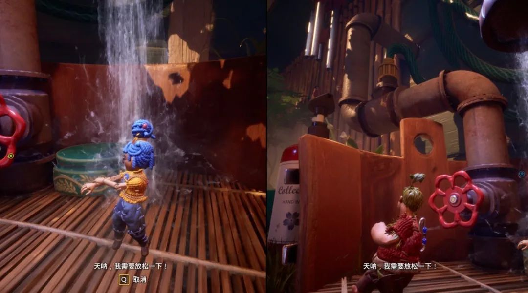 章節:花園小節:園藝大師打完樹根boss後,掀開類似內褲的簾子以後來到的度假區,右手邊打開水龍頭以後沖澡。