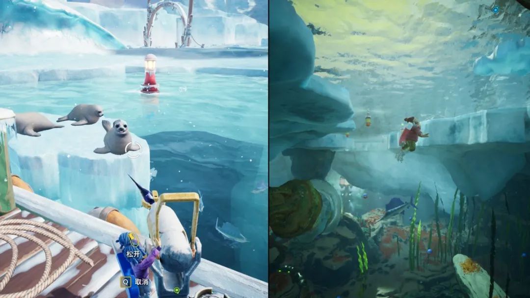 章節:雪景球小節:冰下世界接到修復糖果工廠的任務後,來到湖面的小船上用魚槍抓一隻魚,然後餵給邊上的海豹吃。