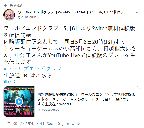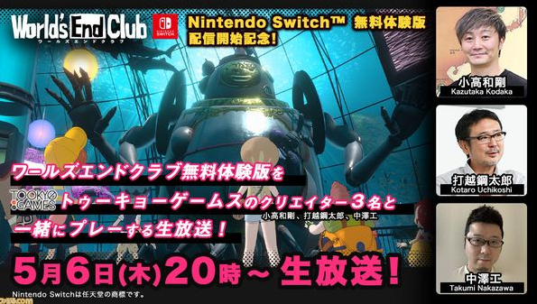 《世界盡頭俱樂部(World』s End Club)》於昨日(4月30日)在官推宣布將於5月6日在Switch平台發布免費體驗版,體驗版提供遊戲的序章劇情,存檔進度可繼承至正式版。