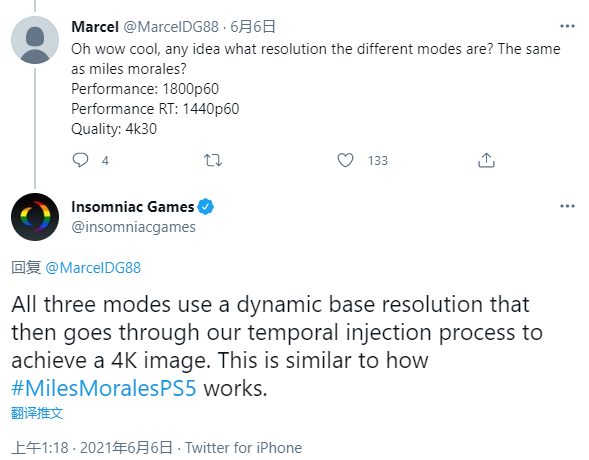 根據 Insomniac Games 後續對網友的回復,《瑞奇與叮噹:分離》的三種畫面模式(性能模式-1800P60FPS、光追性能模式-1440P60FPS、畫質模式-4K30FPS)都採用了動態4K解析度。簡單而言,性能模式下的遊戲解析度會降低,而光追性能模式則會更低,但無論哪種模式都將達到動態4K畫面水準。