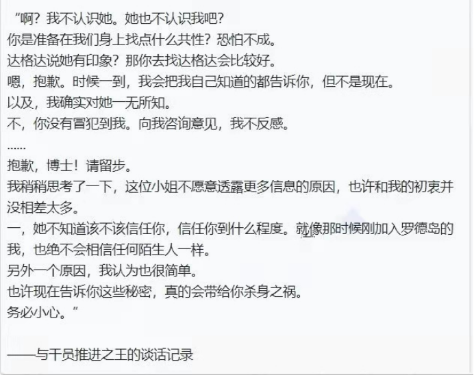 在主線劇情中,正義與邪惡的對決圍繞著源石資源展開,主角所在的羅德島制葯公司是一家注冊醫葯研發公司,長期致力於治癒源石病感染者,而整合運動,則是心懷貪念的「感染者」自發組成掠奪「源石」礦物的組織。圍繞著這條主線,明日方舟在干員的檔案資料里做足了功課,加入了干員自述以及干員之間的對話。盡管這些對話都採用了「碎片化」的呈現方式,但是在勾勒出干員人設的同時,也會在劇情上給予玩家盡可能大的想像空間。比如在五星干員葦草的干員檔案中,可以看到關於六星干員推進之王的訊息。