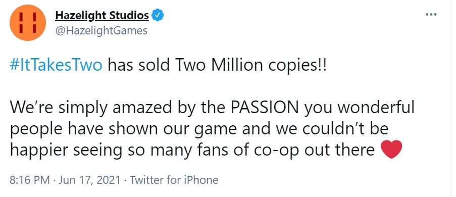 Hazelight工作室官方在Twitter上宣布,《雙人成行》銷量超過了200萬套。