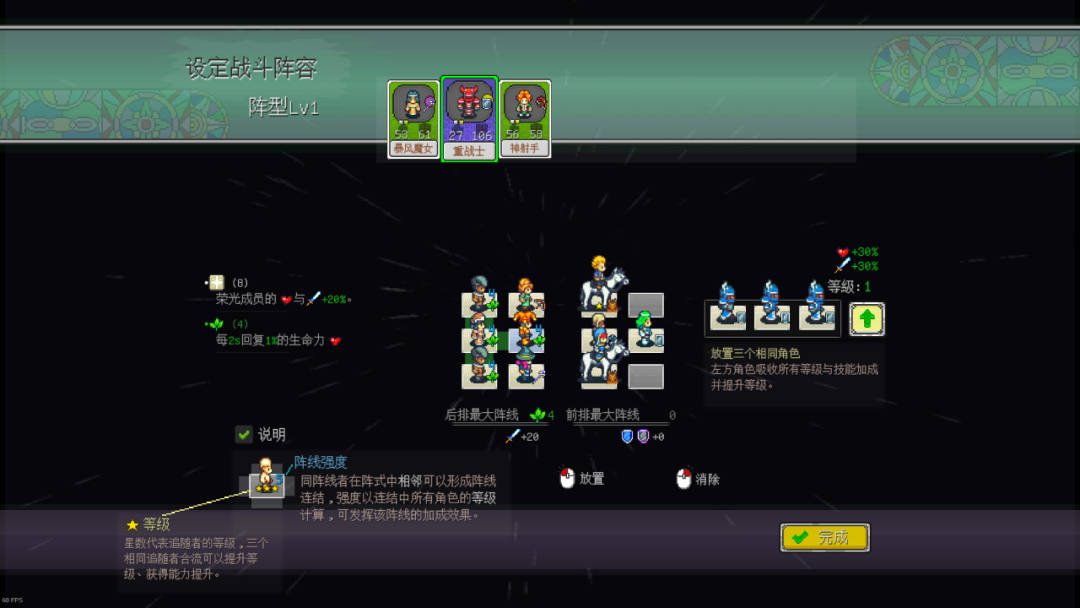 當玩家招募3位相同的追隨者成員,可以在「設定戰鬥陣容」界面升級放置最左的角色並提升其等級。目前隨從成員最高可有三級,提升等級會給追隨者帶來能力提升。追隨者戰鬥陣容分為前、後排,玩家一共可以部署2個3×2陣式。同陣線者在陣式中相鄰則可以形成連接,強度將以連接中所有角色的等級計算,並發揮該陣線的加成效果。