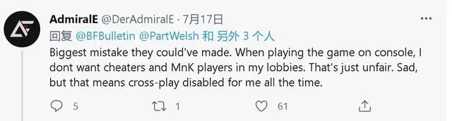 7月17日,擁有4.6萬粉絲的Battlefield Bulletin在社交媒體上寫道:「需要澄清的是,PS5和XSX/S玩家不能在沒有PC玩家的情況下跨平台遊戲,如果你選擇退出跨平台遊戲,那麼只能對戰自己平台的玩家。」