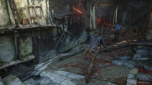 推薦吉普車追逐戰中的戰斗:護航。德雷克被繩子拖著,不用往車上面爬,就邊被拖著邊開槍打摩托車和吉普車,用大威力的黃金左輪加無限子彈,打爆10量載具,跳杯。很輕松。