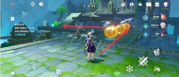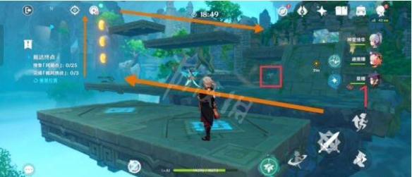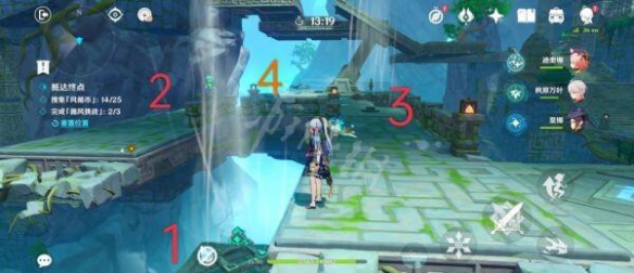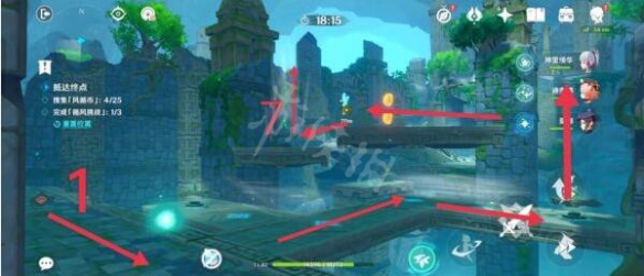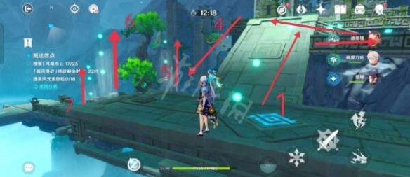 6.來到任務指引處,將左下方的風場方向朝上,並鼓動風場,按照圖中箭頭方向收集風循幣並前進。到達終點,完成。